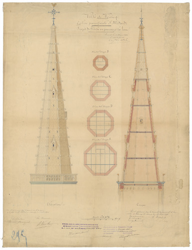 Opschrift: Ville de Wervicq. Eglise paroissiale de St. Médard. Projet de Flêche en pierres pr. La tour Omschrijving plan: ontwerp torenspits Datum KCML: 08/10/1898 Archiefnummer: W1737_02