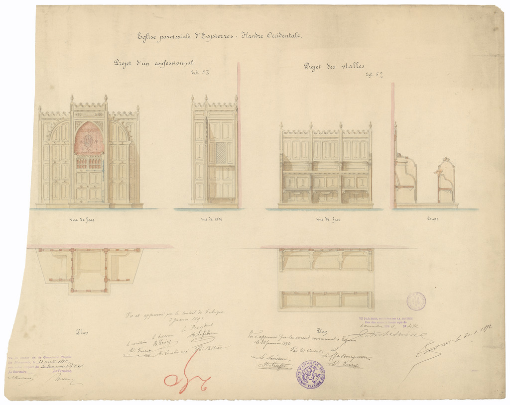 Opschrift: Eglise paroissiale d'Espierres. Flandre Occidentale. Projet d'un confessionnal. Projet des stalles. Omschrijving plan: ontwerp biechtstoelen en koorgestoelte Datum KCML: 23/04/1892 Archiefnummer: W1905