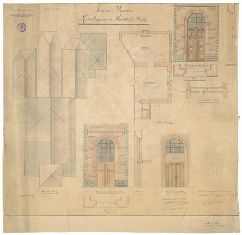 Opschrift: Gemeente Heestert. Herstelling aan de Parochiale Kerk Omschrijving plan: plattegrond, plan bedaking, detailtekeningen Datum KCML: 19/12/1896 Archiefnummer: W1891
