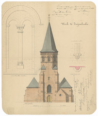 Opschrift: Kerk te Zuijenkerke. Omschrijving plan: opstand voorgevel en detailtekeningen Datum KCML: 06/06/1891 Archiefnummer: W1871