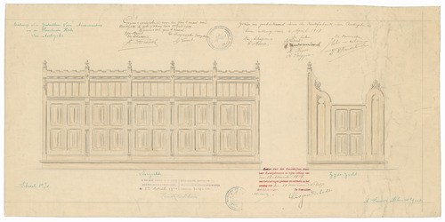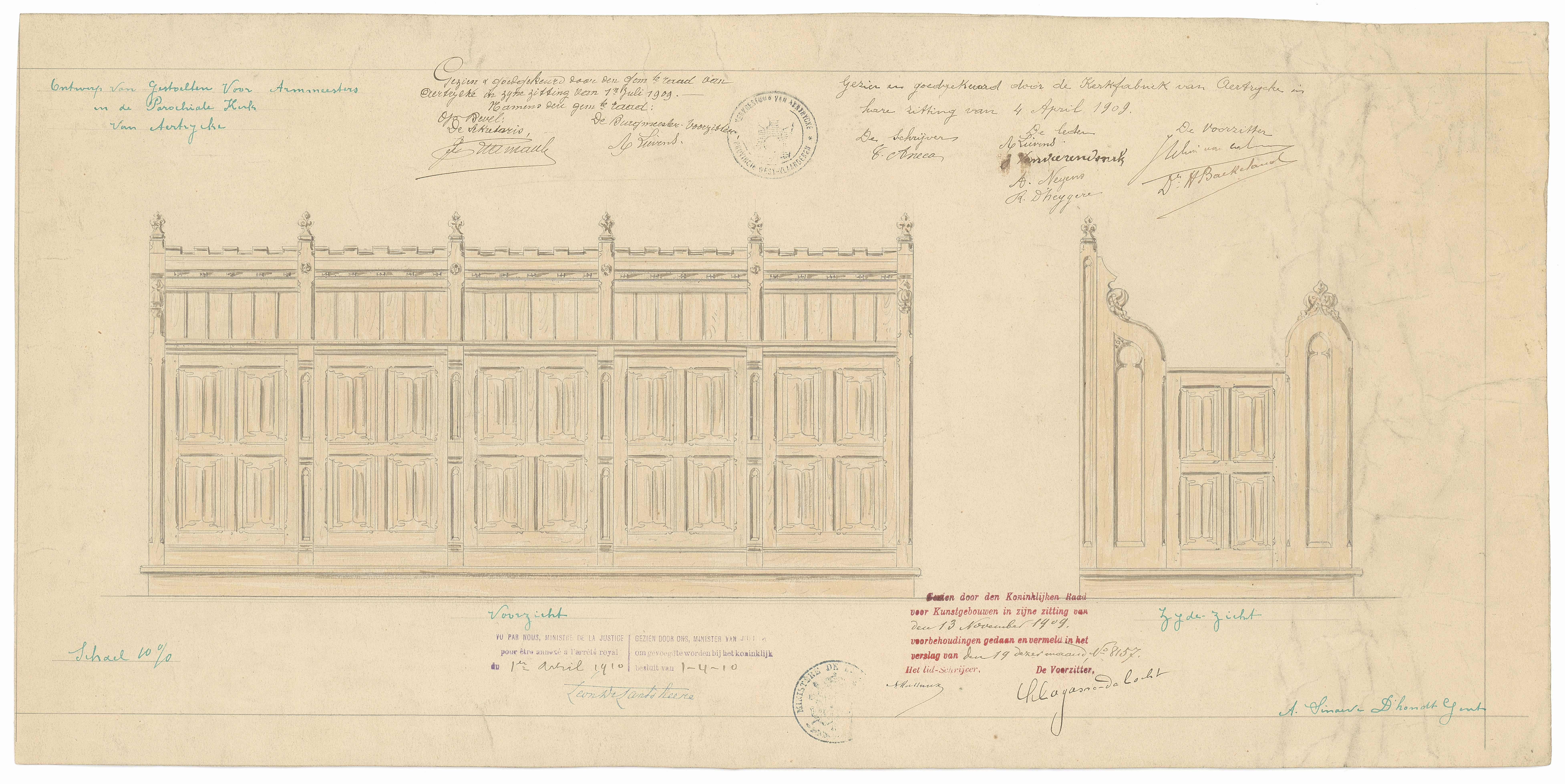 Opschrift: Ontwerp van gestoelten voor armmeesters in de Parochiale Kerk van Aertrycke Omschrijving plan: ontwerp gestoelte armenmeesters Datum KCML: 13/11/1909 Archiefnummer: W1830