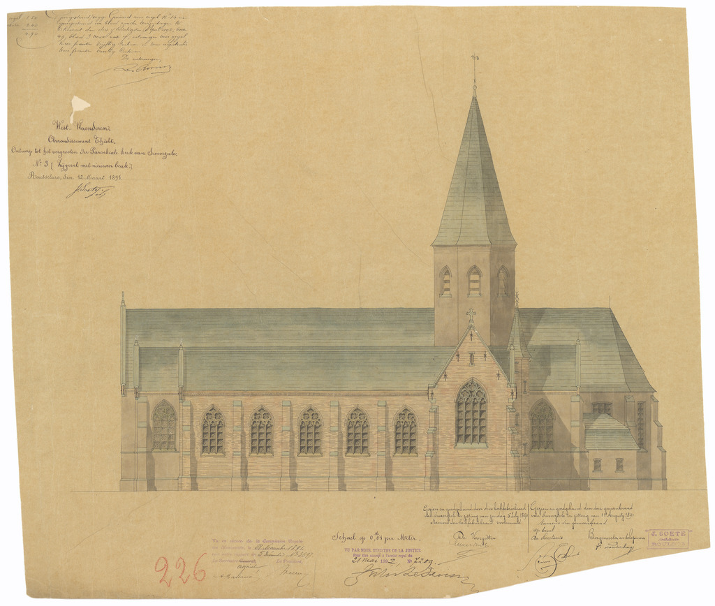 Opschrift: West-Vlaanderen. Arrondissement Thielt. Gemeente Swevezeele. Ontwerp tot het vergrooten der Parochiale Kerk. Omschrijving plan: opstand zijgevel 1 Datum KCML: 28/11/1891 Archiefnummer: W1807