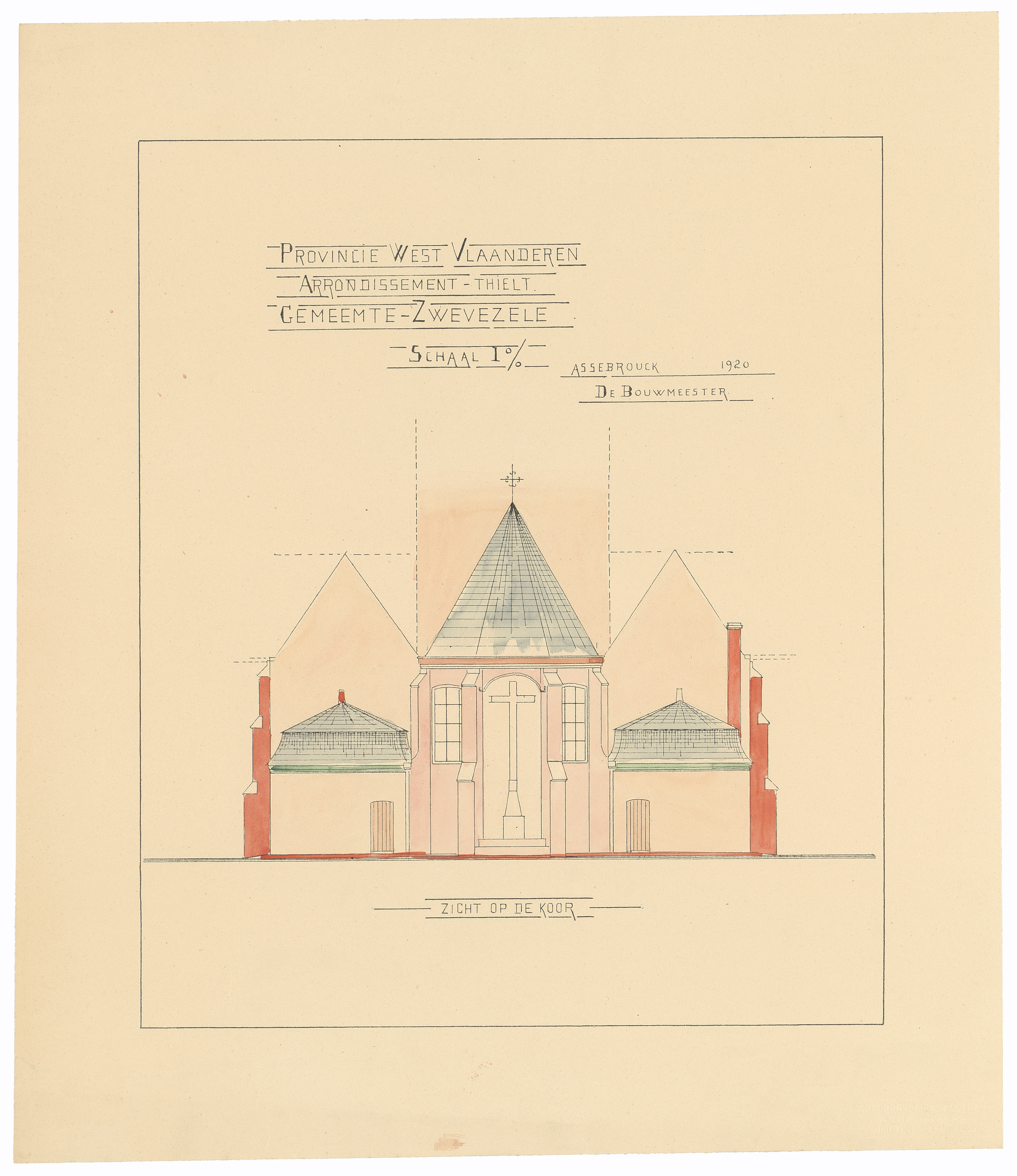 Drager: papier Techniek: kalkafdruk, opgehoogd met aquarel Afmetingen (h x b in mm): 471 x 412 mm Schaal: 1/100