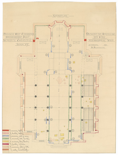 Opschrift: Provincie West Vlaanderen. Arrondissement Thielt. Gemeente Zwevezele. Ontwerp tot herstelling der Kerk. Omschrijving plan: plattegrond niveau 0 Datum KCML: deze informatie wordt niet vermeld op het archiefstuk Archiefnummer: W1813