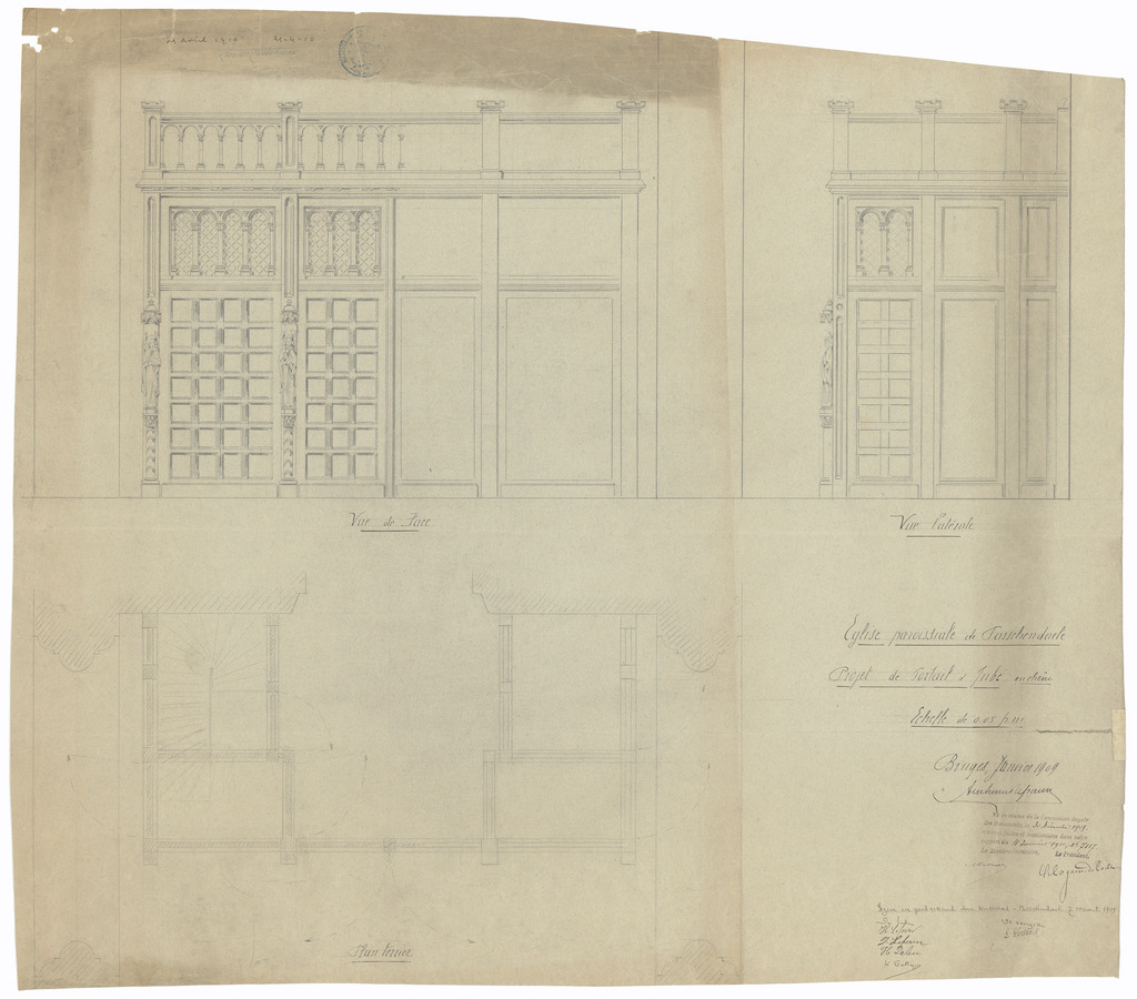 Opschrift: Eglise paroissiale de Passchendaele. Projet de Portail & Jubé en chêne. Omschrijving plan: ontwerp portaal en hoogzaal Datum KCML: 30/12/1909 Archiefnummer: W1869