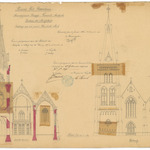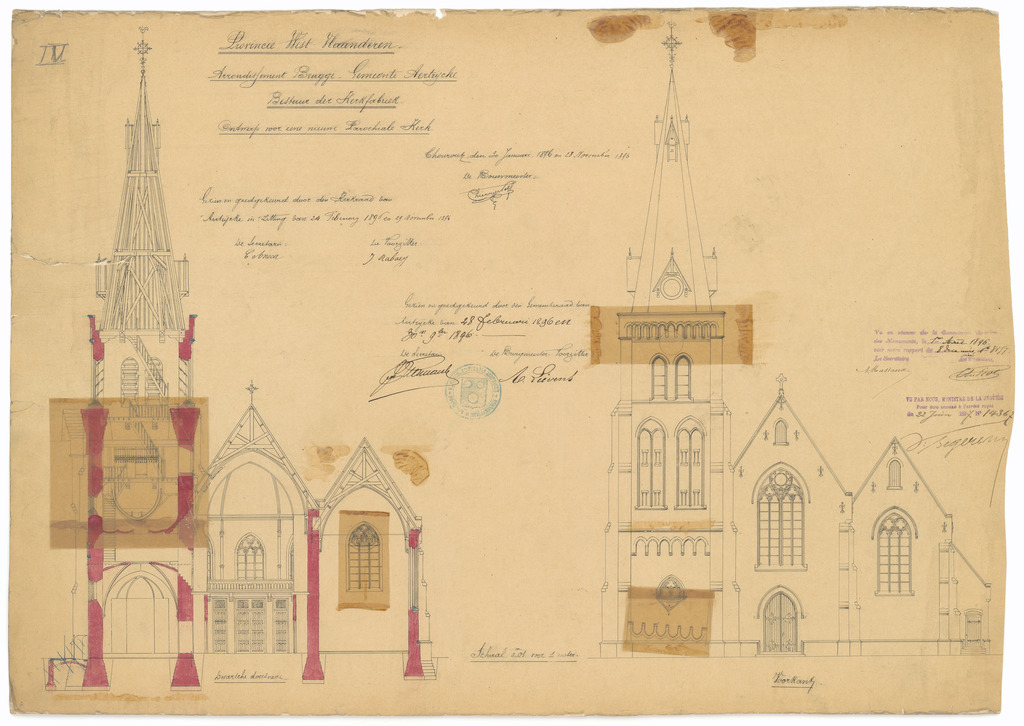 Opschrift: Provincie West-Vlaanderen. Arrondissement Brugge - Gemeente Aertrijke. Bestuur der Kerkfabriek. Ontwerp voor eene nieuwe Parochiale Kerk. Omschrijving plan: opstand voorgevel en dwarsdoorsnede Datum KCML: 01/08/1896 Archiefnummer: W1821_02