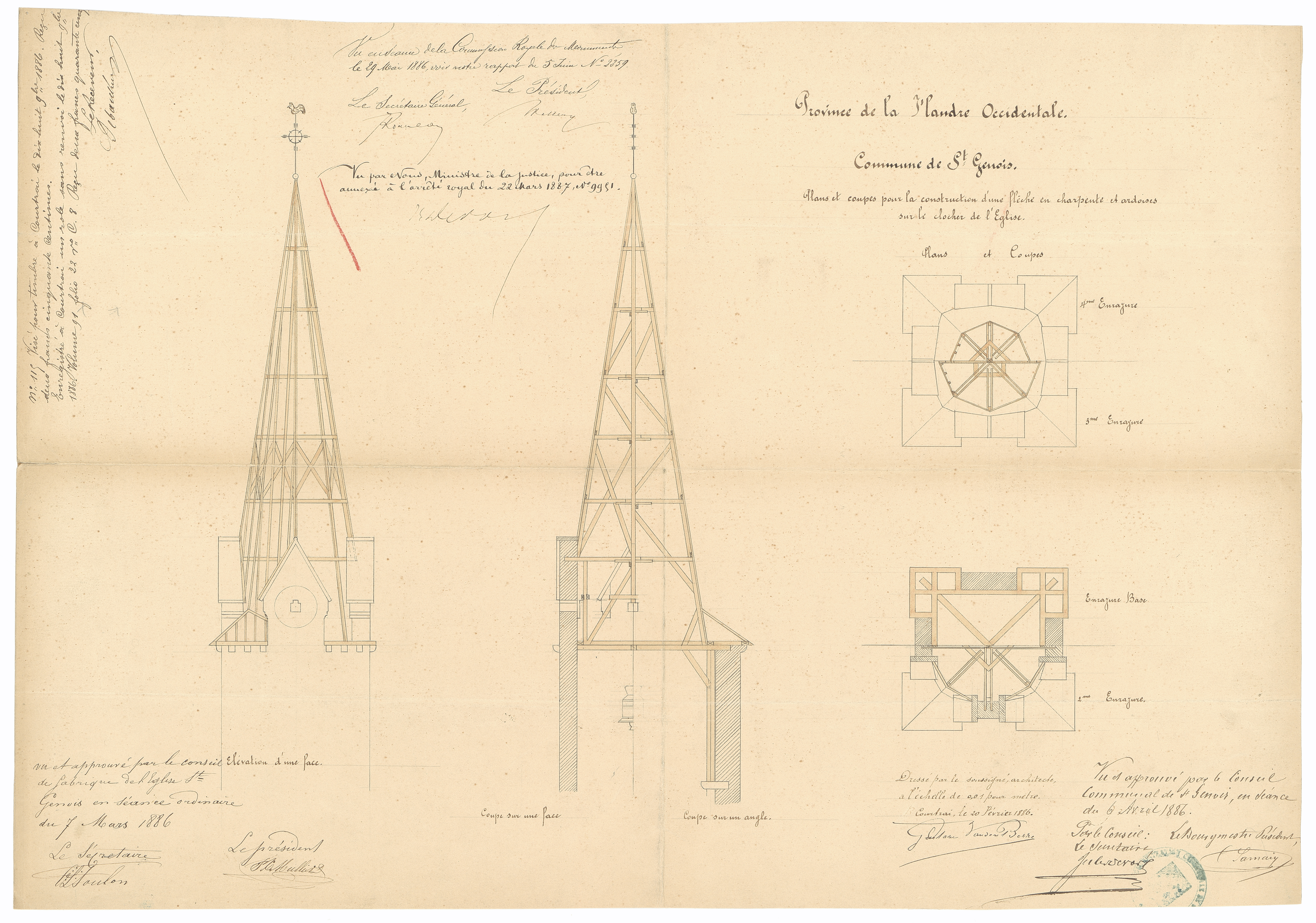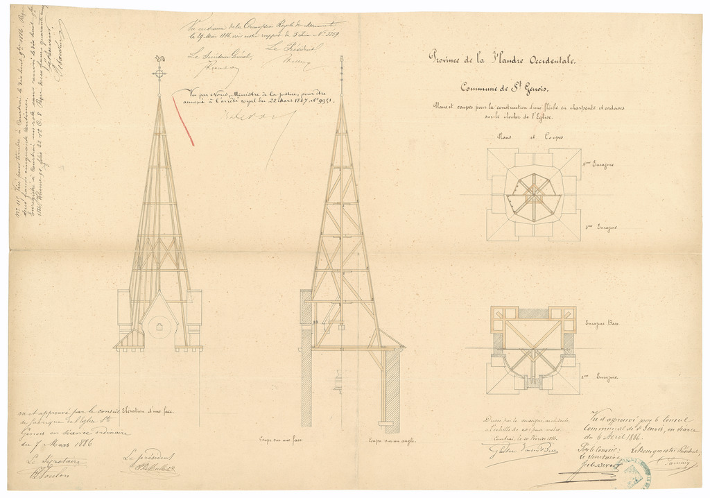 Opschrift: Province de la Flandre Occidentale. Commune de St. Genois. Plan pour la construction d'une fleche en charpente et ardoises sur le clocher de l'Eglise Omschrijving plan: plattegronden, doorsneden toren Datum KCML: 29/05/1886 Archiefnummer: W1901