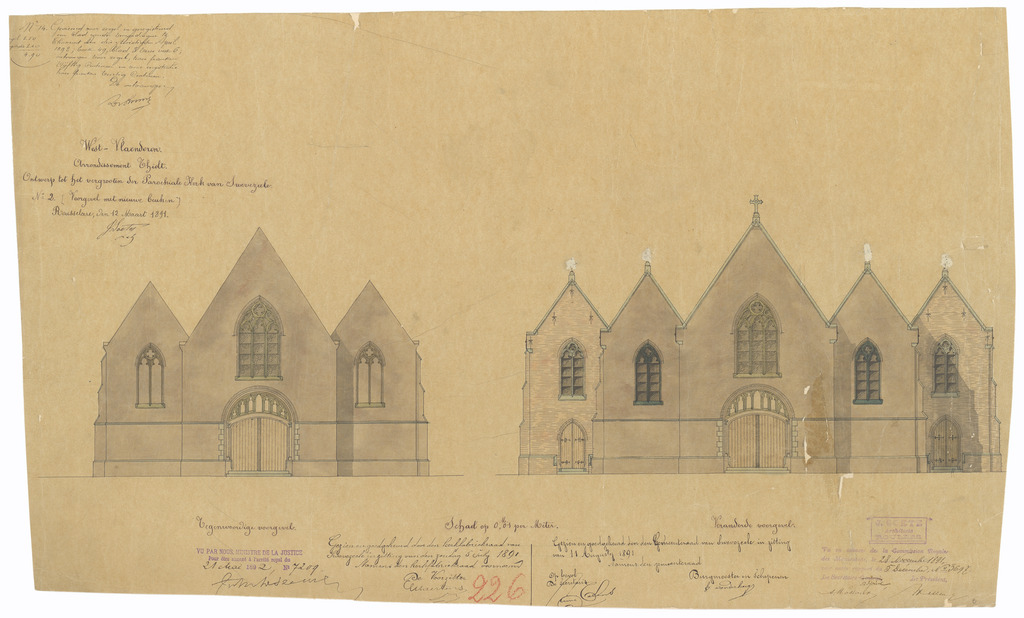 Opschrift: West-Vlaanderen. Arrondissement Thielt. Gemeente Swevezeele. Ontwerp tot het vergrooten der Parochiale Kerk. Omschrijving plan: opstand voorgevel Datum KCML: 28/11/1891 Archiefnummer: W1806