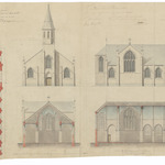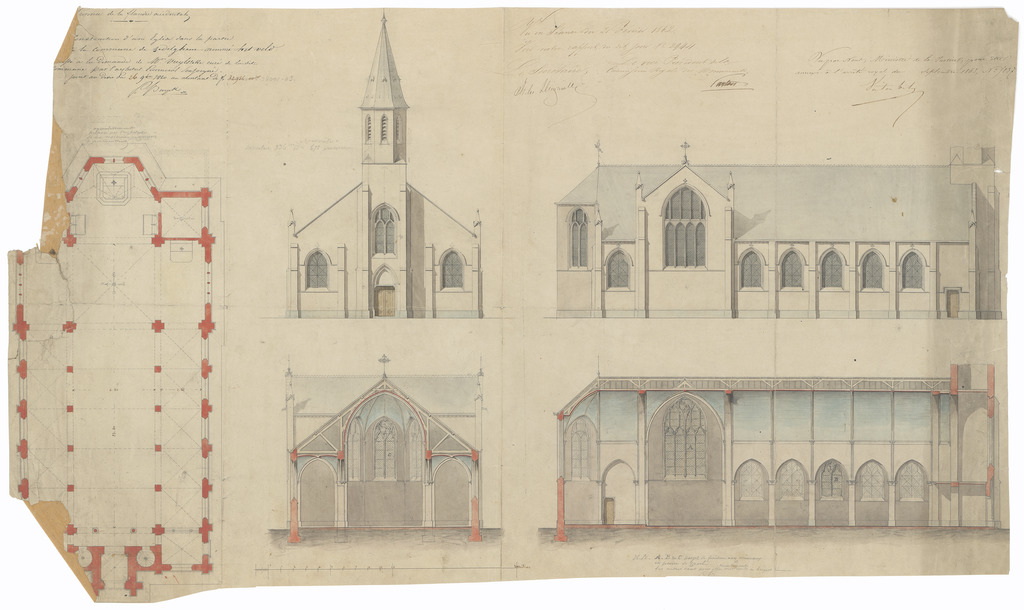 Opschrift: Province de la flandre occidentale. Construction d'une église dans la partie de la commune de Zedelgehm nommé het veld. Omschrijving plan: plattegrond, gevelopstanden, doorsneden Datum KCML: 21/02/1862 Archiefnummer: W1838