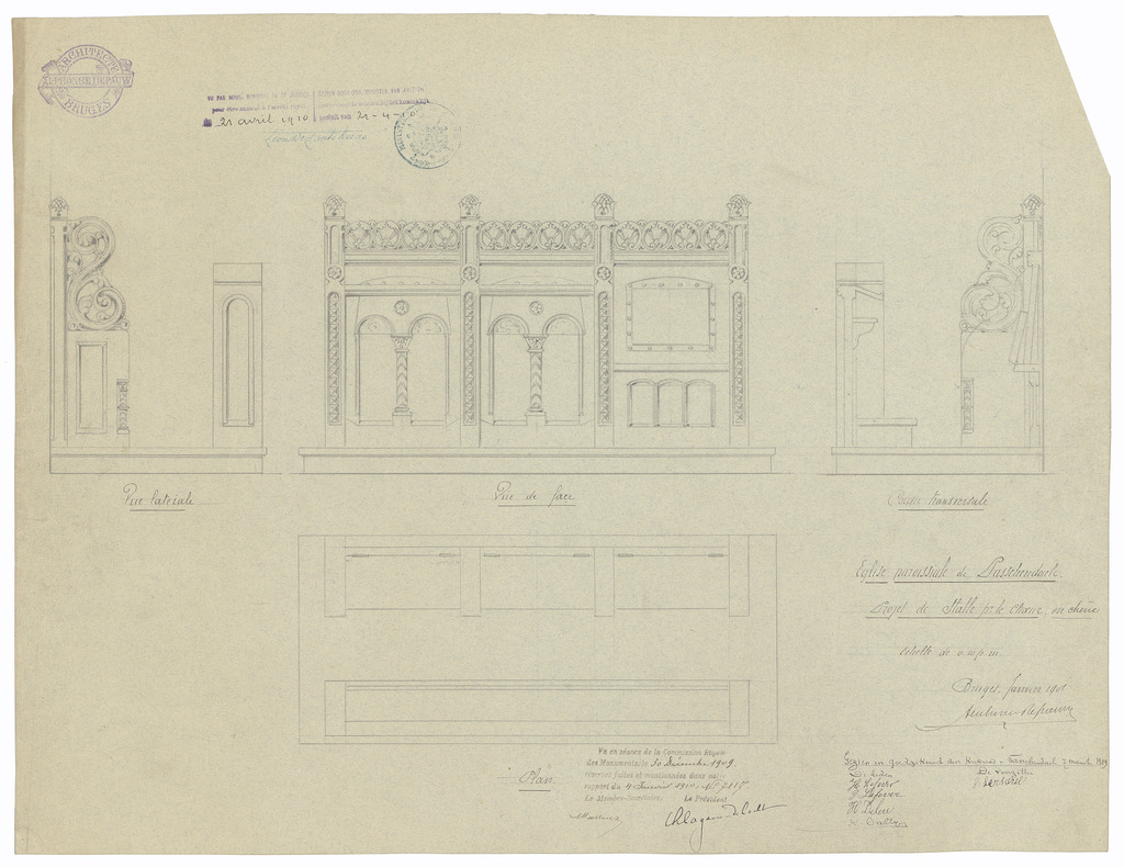 Opschrift: Eglise paroissiale de Passchendaele. Projet de Stalles pr. le choeur en chêne Omschrijving plan: ontwerp koorgestoelte Datum KCML: 30/12/1909 Archiefnummer: W1865