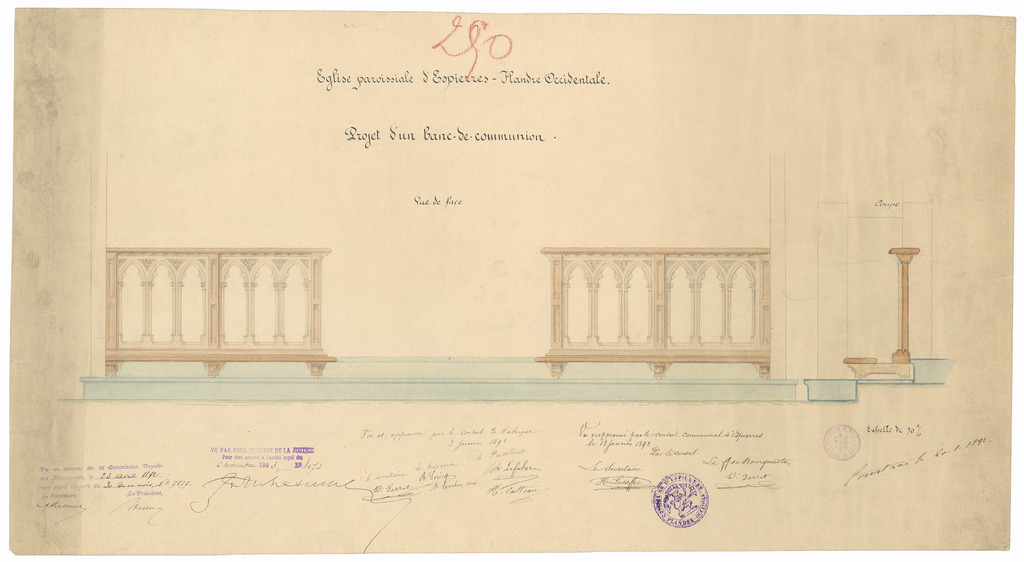 Opschrift: Eglise paroissiale d'Espierres - Flandre Occidentale. Projet d'un banc-de-communion Omschrijving plan: ontwerp communiebank Datum KCML: 23/04/1892 Archiefnummer: W1906