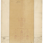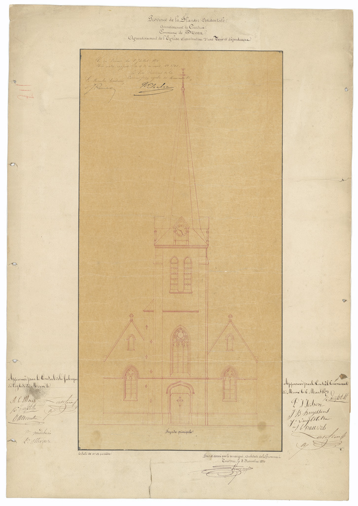 Opschrift: Province de la Flandre Occidentale. Arrondissement de Courtrai. Commune de Moen. Agrandissement de l'Eglise et construction d'une tour et dépendances. Omschrijving plan: opstand voorgevel Datum KCML: 01/07/1871 Archiefnummer: W1892