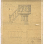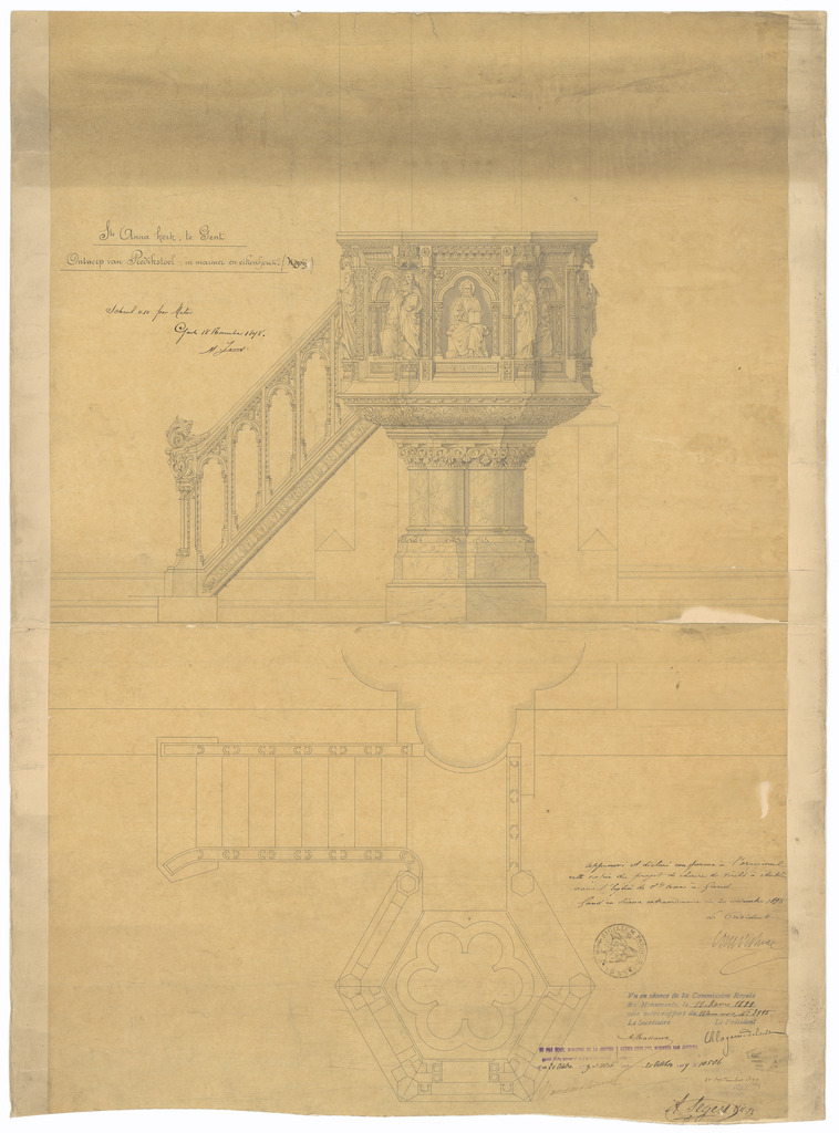 Opschrift: Ste. Anna Kerk te Gent. Ontwerp van Predikstoel, in marmer en eikenhout. Omschrijving plan: plattegrond en vooraanzicht preekstoel Datum KCML: 11/03/1899 Archiefnummer: O1506