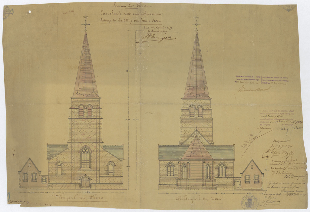 Opschrift: Provincie Oost-Vlaanderen. Parochiale kerk van Massemen. Ontwerp tot herstelling van toren en daken. Omschrijving plan: opstand voor- en achtergevel Datum KCML: 23/06/1900 Archiefnummer: O1328