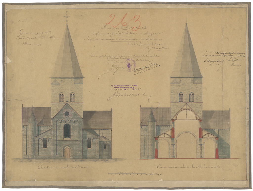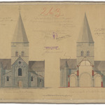 Opschrift: Province de la Flandre Orientale. Eglise paroissiale de St. Pierre à Huysse. Projet de restauration & de reconstruction des nef & bascôtés. Omschrijving plan: opstand voorgevel en dwarsdoorsnede Datum KCML: 19/04/1890 Archiefnummer: O1389