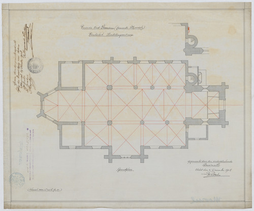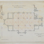 Opschrift: Parochiekerk. Herstellingsontwerp. Omschrijving plan: plattegrond niveau 0 Datum KCML: deze informatie wordt niet vermeld op het archiefstuk Archiefnummer: O0078
