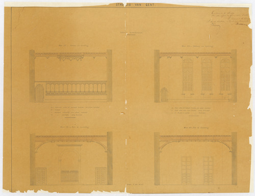 Opschrift: Stadhuis van Gent. Groote benedenzaal Omschrijving plan: opstanden gevels Datum KCML: 19/11/1870 Archiefnummer: O1697