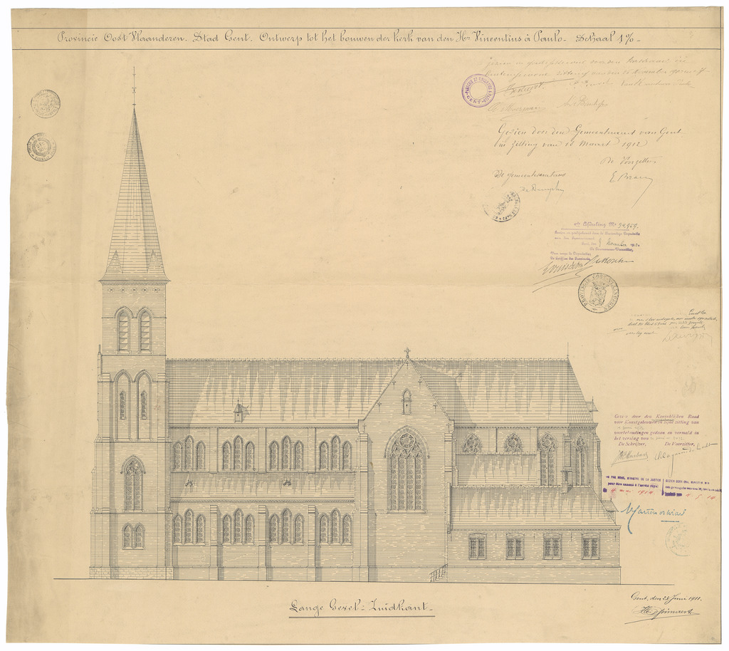 Opschrift: Provincie Oost-Vlaanderen. Stad Gent. Ontwerp tot het bouwen der kerk van den H.Vincentius à Paulo. Omschrijving plan: opstand Z-gevel Datum KCML: 15/06/1912 Archiefnummer: O1684