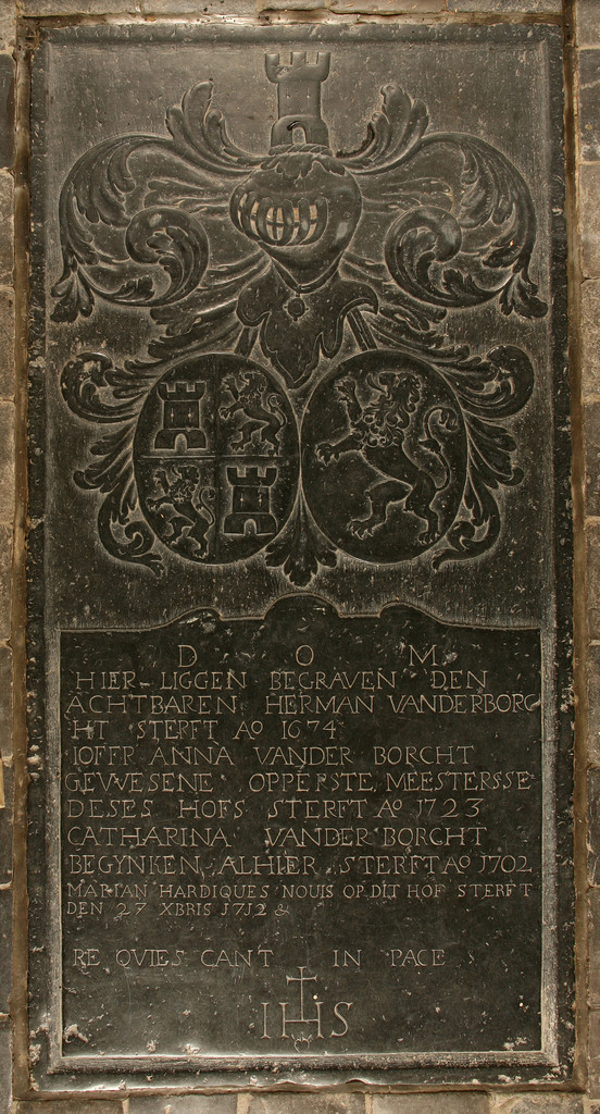 De grafsteen van Anna Vanderborcht in de vierde travee van de middenbeuk. Het wapen en het opschrift stralen duidelijk de sociale stand van haar familie uit (epitaaf 22A) Publicatie(s): Relicta Monografieën 2; In zuiverheid leven. Het Sint-Agnesbegijnhof van Sint-Truiden Label(s): begijnhofkerken, interieurs, graftekens