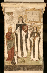 Van links naar rechts de Heilige Catharina van Alexandrië, de Heilige Catharina van Siena, de Heilige Agnes van Montepulciano. Links knielt een biddende begijn Publicatie(s): Relicta Monografieën 2; In zuiverheid leven. Het Sint-Agnesbegijnhof van Sint-Truiden Label(s): begijnhofkerken, schilderingen