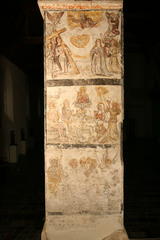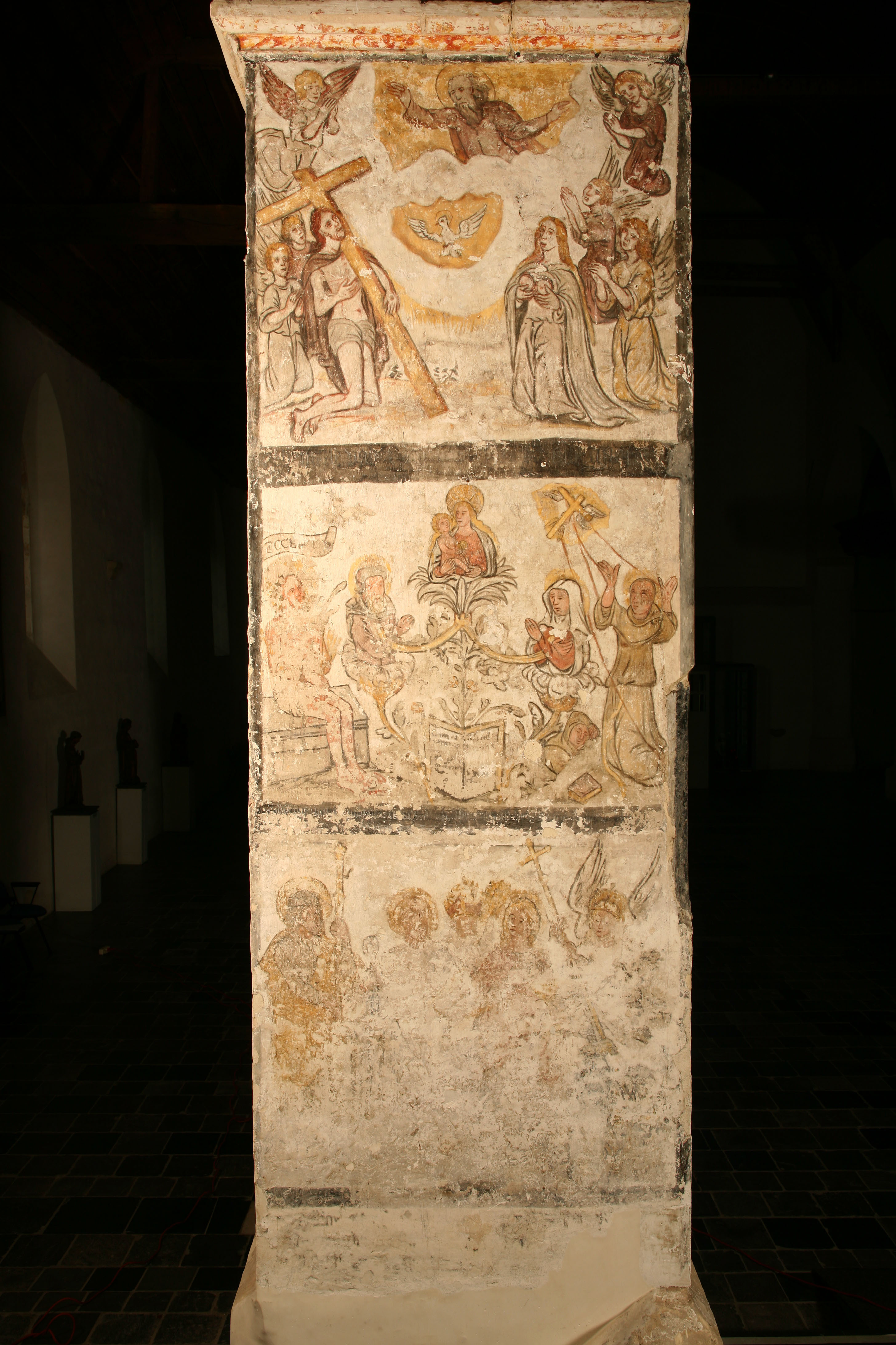Bovenaan de Trap des Heils, in het midden een zittende Christus als Ecce Homo, een Boom van Jesse, en de Stigmatisatie van Franciscus, onderaan Jacob de Meerdere, Laurentius, een heilige bisschop, Johannes Evangelist en de aartsengel Michael Publicatie(s): Relicta Monografieën 2; In zuiverheid leven. Het Sint-Agnesbegijnhof van Sint-Truiden Label(s): begijnhofkerken, schilderingen
