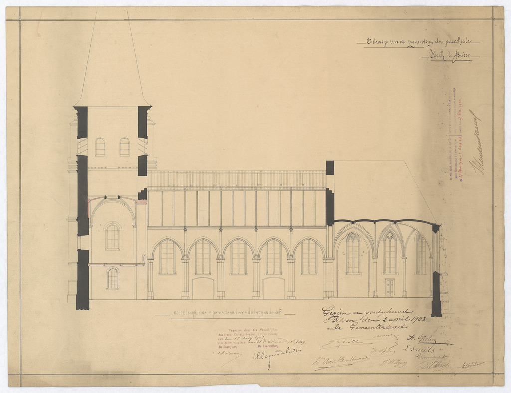 Opschrift: Ontwerp voor de vergrooting der parochiale kerk te Bilzen Omschrijving plan: langsdoorsnede middenschip Datum KCML: 18-7-1903 Archiefnummer: L0068