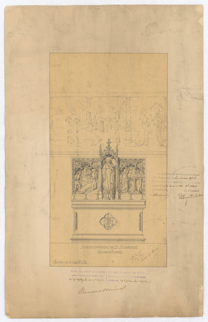 Opschrift: Autel latéral de Ste Aldegonde. Eglise d'Alken. Omschrijving plan: ontwerp zijaltaar Sint-Aldegonde Datum KCML: 20-4-1901 Archiefnummer: L0006