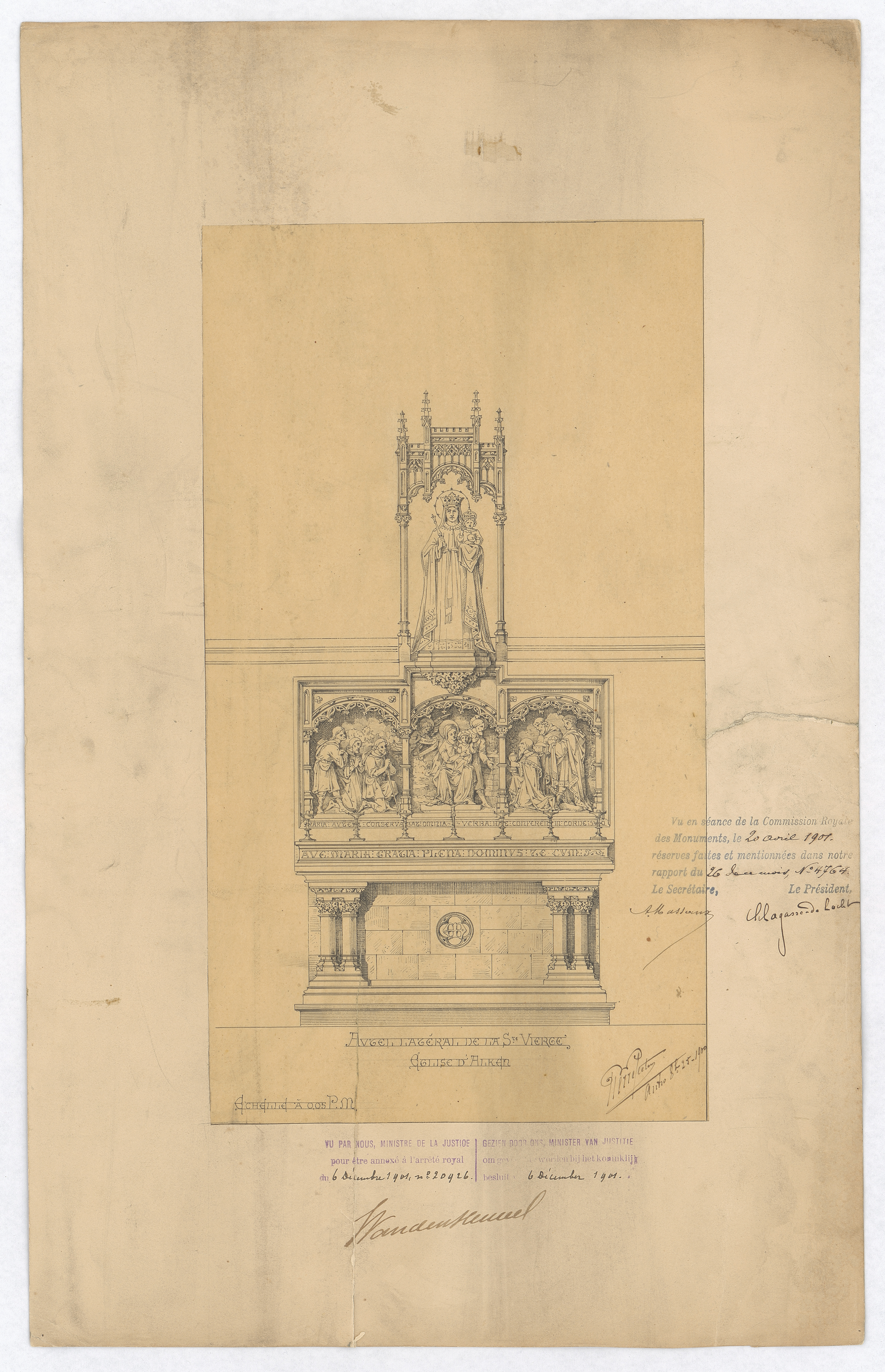 Opschrift: Autel latéral de la Ste Vierge. Eglise d'Alken. Omschrijving plan: ontwerp zijaltaar Onze-Lieve-Vrouw Datum KCML: 20-4-1901 Archiefnummer: L0005