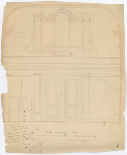 Opschrift: Projet du Buffet d'Orgue à construire dans l'église du Camp de Beverloo Omschrijving plan: ontwerp orgelkast Datum KCML: deze informatie wordt niet vermeld op het archiefstuk Archiefnummer: L0040