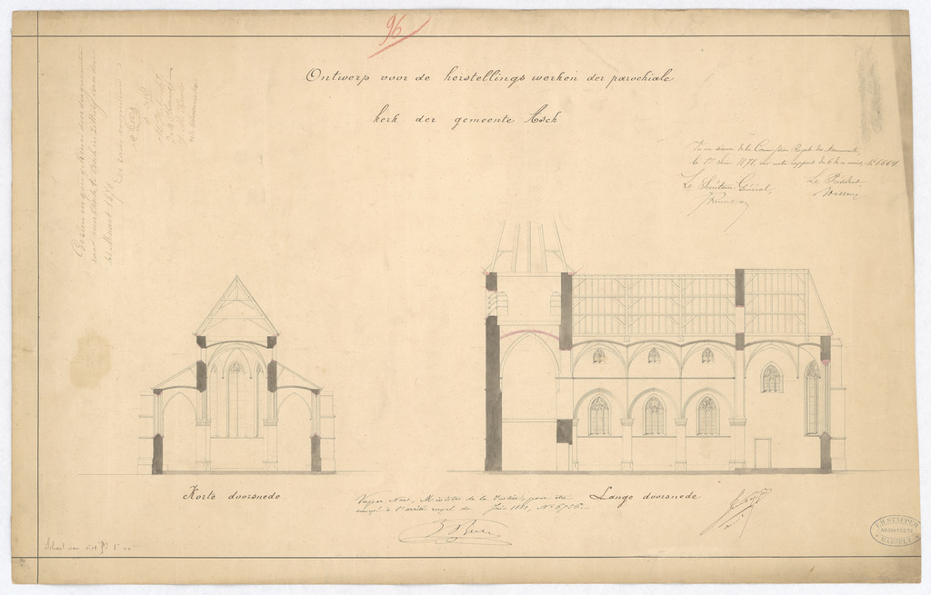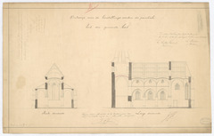 Opschrift: Ontwerp voor de herstellingswerken der parochiale kerk der gemeente Asch (Limburg) Omschrijving plan: dwarsdoorsnede naar het koor, langsdoorsnede Datum KCML: 01/07/1878 Archiefnummer: L0021