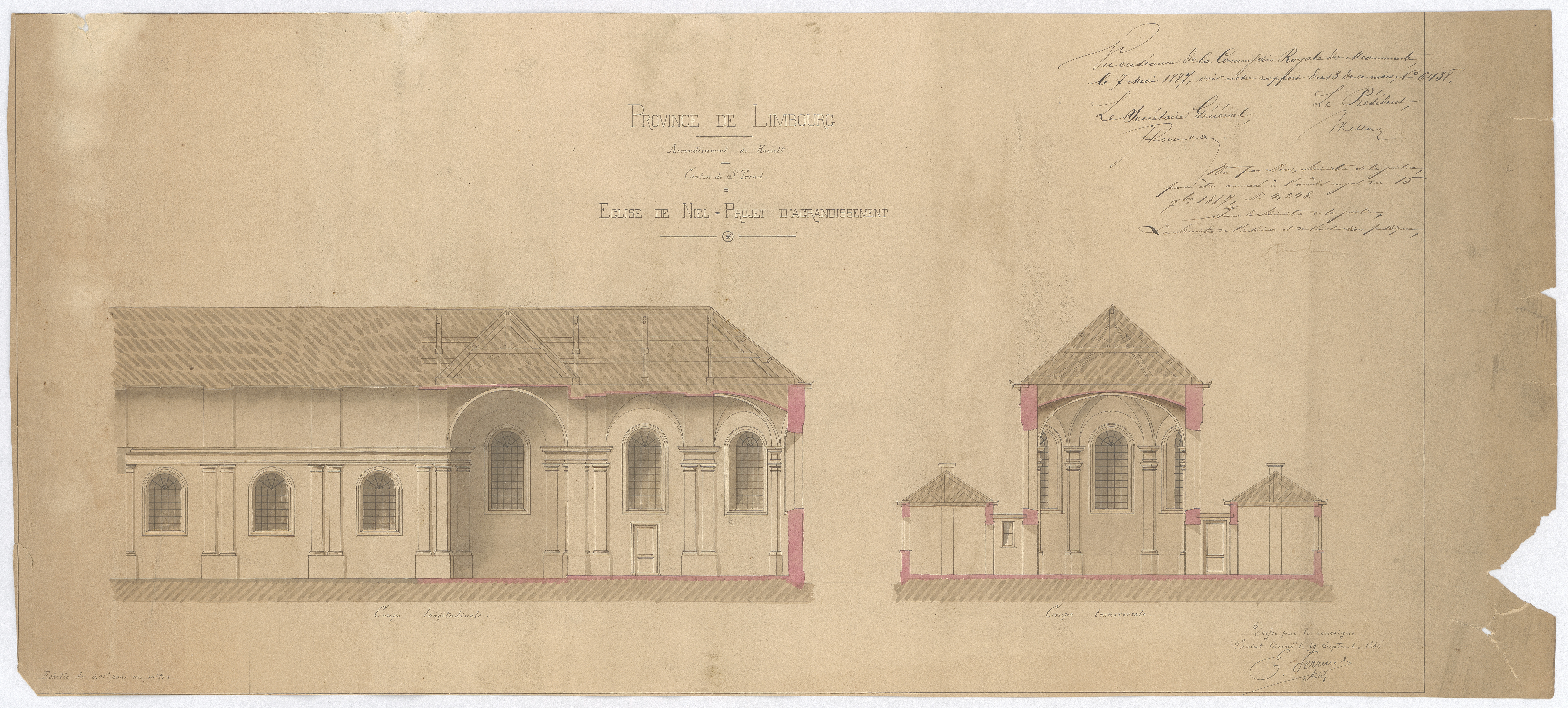 Opschrift: Province de Limbourg. Arrondissement de Hasselt. Canton de St. Trond. Eglise de Niel. Projet d'agrandissement. Omschrijving plan: langsdoorsnede, dwarsdoorsnede Datum KCML: 07/05/1887 Archiefnummer: L0027