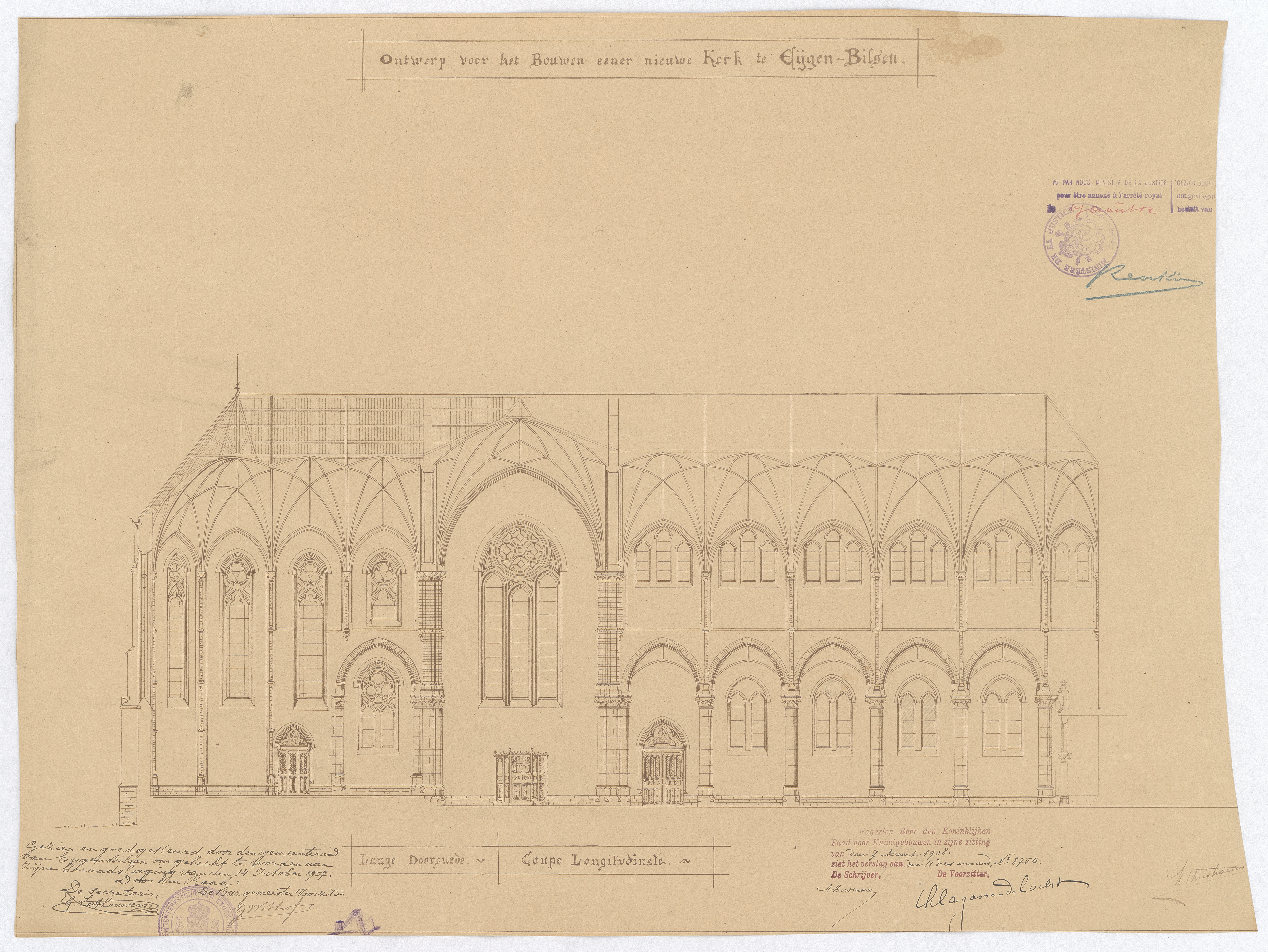 Opschrift: Ontwerp voor het bouwen eener nieuwe kerk te Eijgen-Bilsen - Lange doorsnede Omschrijving plan: langsdoorsnede Datum KCML: 7-3-1908 Archiefnummer: L0083