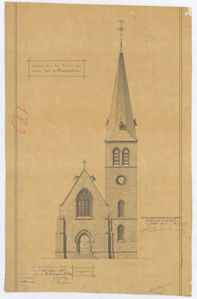 Opschrift: Ontwerp voor het bouwen eener nieuwe kerk te Martenslinde - Voorgevel Omschrijving plan: opstand N-gevel Datum KCML: 14/05/1892 Archiefnummer: L0096