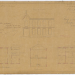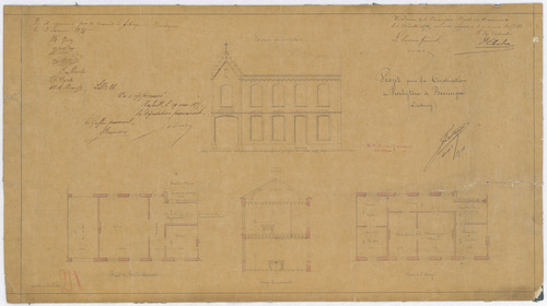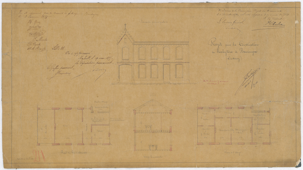 Opschrift: Projet pour la Construction du presbytère de Beeringen (Limbourg) Omschrijving plan: opstand voorgevel, plattegrond niveau 0, dwarsdoorsnede, plattegrond niveau 1 Datum KCML: 04/12/1874 Archiefnummer: L0028