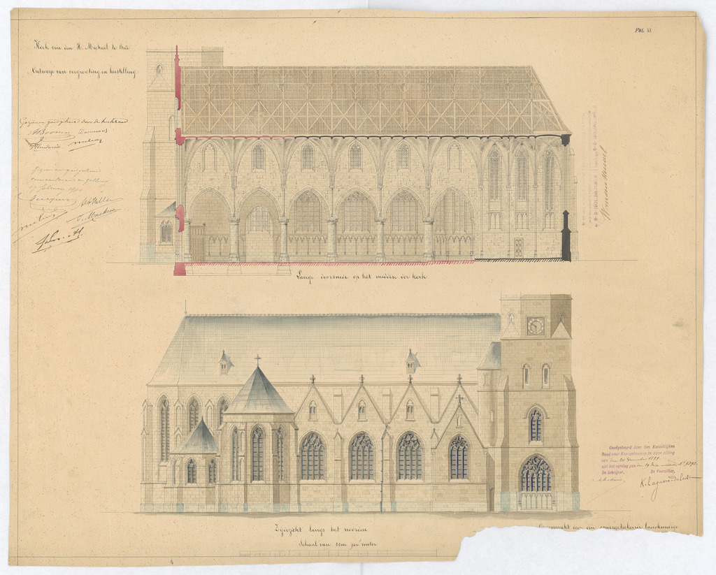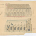 Opschrift: Kerk van den H. Michaeël te Bree ontwerp van vergrooting en herstelling Omschrijving plan: langsdoorsnede kerk, opstand N-gevel Datum KCML: 24/12/1899 Archiefnummer: L0170