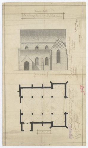 Opschrift: Plan der beuken en kruisbeuk der parochiale kerk gevoegd bij het bestek der herstellingswerken aan deze kerk te verrichten Omschrijving plan: opstand zijgevel, plattegrond niveau 0 Datum KCML: 06/01/1894 Archiefnummer: L0130