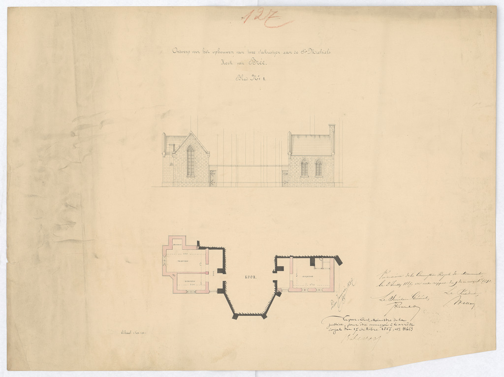 Opschrift: Ontwerp van het opbouwen van twee sakristijen aan de Sint-Michiels Omschrijving plan: zicht op sacristieën aan weerszijden van het koor, grondplan Datum KCML: 02/07/1887 Archiefnummer: L0188