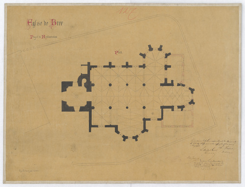 Opschrift: Église de Bree Projet de restauration Omschrijving plan: plattegrond niveau 0 Datum KCML: 02/07/1887 Archiefnummer: L0182