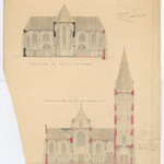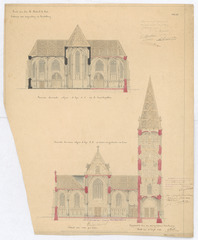 Opschrift: Kerk van den H. Michaël te Bree ontwerp van vergrooting en herstelling Omschrijving plan: dwarsdoorsnede, lijn C-D op de kruiskapellen, dwarsdoorsnede, lijn A-B op midden- ej zijbeuken en toren Datum KCML: 24/12/1899 Archiefnummer: L0189
