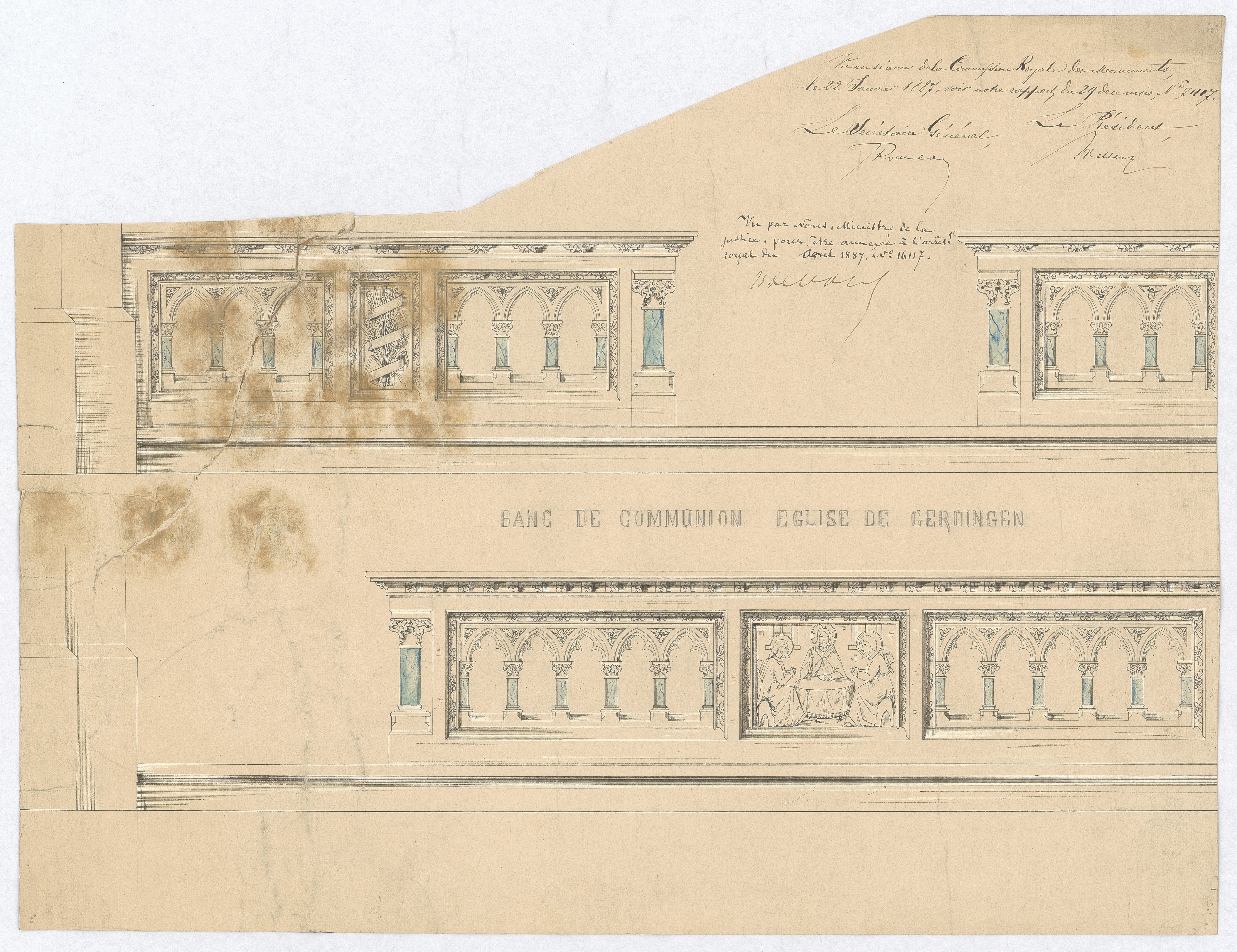 Opschrift: Banc de communion de l'église de Gerdingen Omschrijving plan: ontwerp communiebank Datum KCML: 22/01/1887 Archiefnummer: L0194