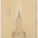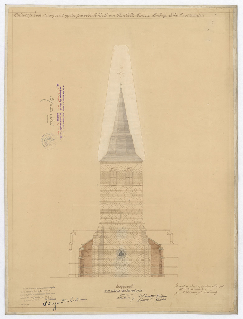 Opschrift: Ontwerp voor de vergrooting der parochiale kerk van Bocholt Omschrijving plan: opstand voorgevel Datum KCML: 15-1-1910 Archiefnummer: L0129