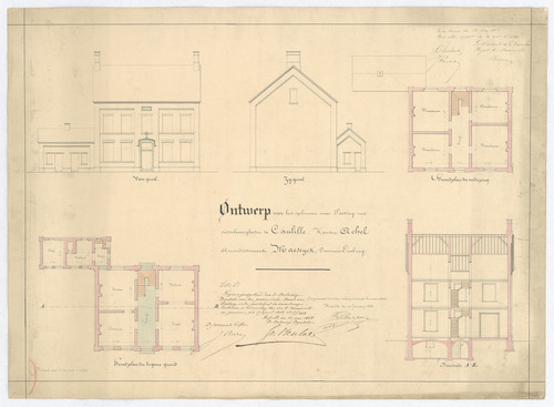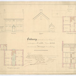 Opschrift: Ontwerp voor het opbouwen eener pastorij met onderhoorigheden te Caulille Omschrijving plan: opstand voorgevel, opstand zijgevel, plattegrond niveau 0, plattegrond niveau 1, dwarsdoorsnede Datum KCML: 26/05/1868 Archiefnummer: L0152