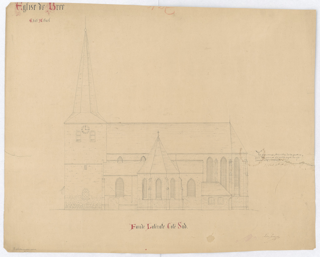 Opschrift: Église de Bree état actuel Omschrijving plan: opstand Z-gevel Datum KCML: deze informatie wordt niet vermeld op het archiefstuk Archiefnummer: L0187