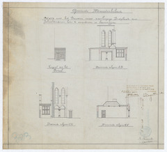 Opschrift: Ontwerp voor het bouwen eener voorloopige bidplaats voor schoolkinderen, later te veranderen in sacristijen Omschrijving plan: opstand voorgevel portaal, dwarsdoorsnede, langsdoorsnede Datum KCML: 13-8-1910 Archiefnummer: L0103