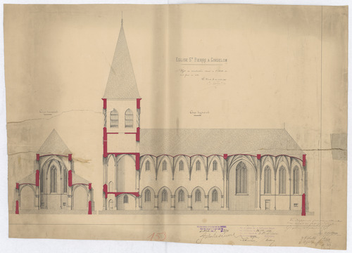 Opschrift: Église saint Pierre à Gingelom projet de reconstruction Omschrijving plan: dwarsdoorsneden, koor, langsdoorsnede Datum KCML: 26/09/1891 Archiefnummer: L0266
