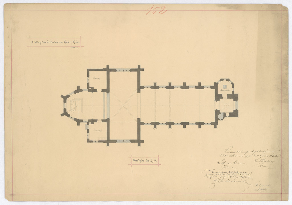 Opschrift: Ontwerp voor het bouwen eener kerk te Eelen - grondplan der kerk Omschrijving plan: plattegrond niveau 0 Datum KCML: 03/03/1888 Archiefnummer: L0230