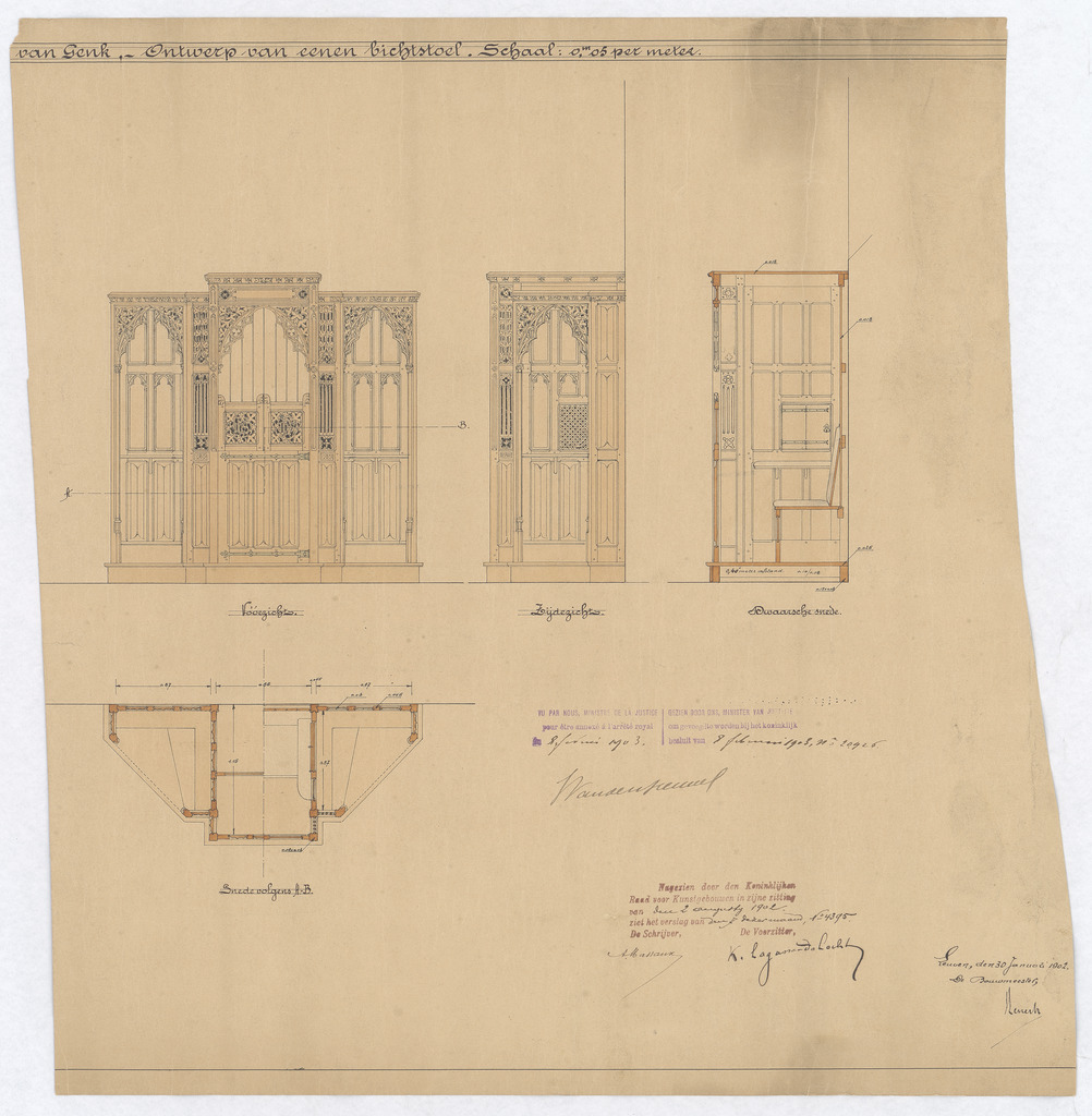 Opschrift: [verdwenen] van Genk - ontwerp van eenen bichtstoel Omschrijving plan: ontwerp biechtstoel Datum KCML: 2-8-1902 Archiefnummer: L0243