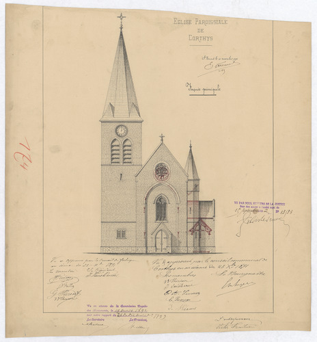 Opschrift: Église paroissiale de Corthys Omschrijving plan: opstand voorgevel Datum KCML: 19/03/1892 Archiefnummer: L0278