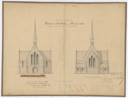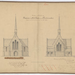Opschrift: Hameau de petit frésin sous Montenaeken projet pour la construction d'une nouvelle église Omschrijving plan: opstand W-gevel, opstand O-gevel Datum KCML: 18/10/1875 Archiefnummer: L0269