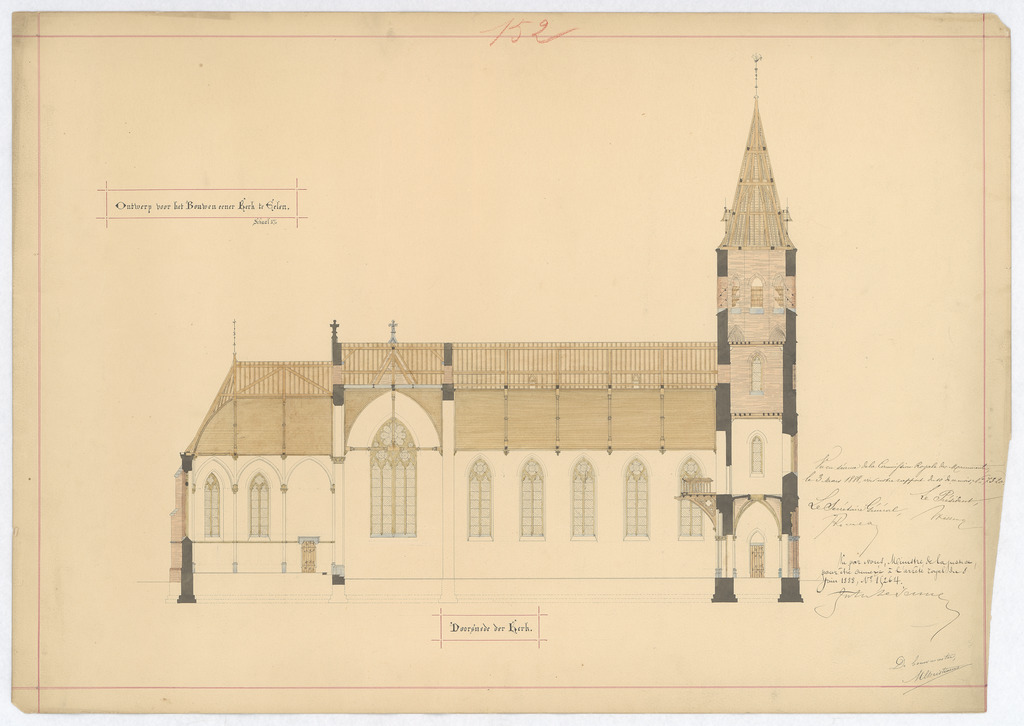 Opschrift: Ontwerp voor het bouwen eener kerk te Eelen - doorsnede der kerk Omschrijving plan: langsdoorsnede Datum KCML: 03/03/1888 Archiefnummer: L0231